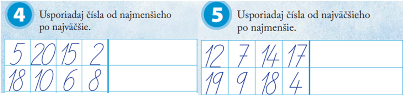 - doplniť chýbajúce čísla do vzostupného aj zostupného číselného radu, vymenovať niekoľko čísel menších (väčších) ako dané číslo