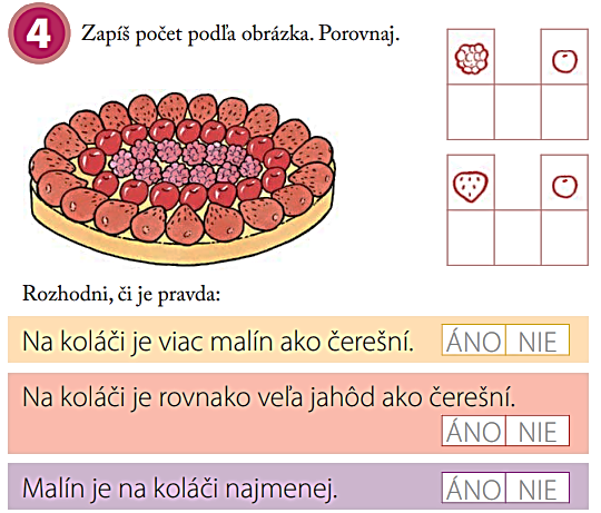 - porovnať počet prvkov v dvoch skupinách (počítaním i na prvý pohľad)
